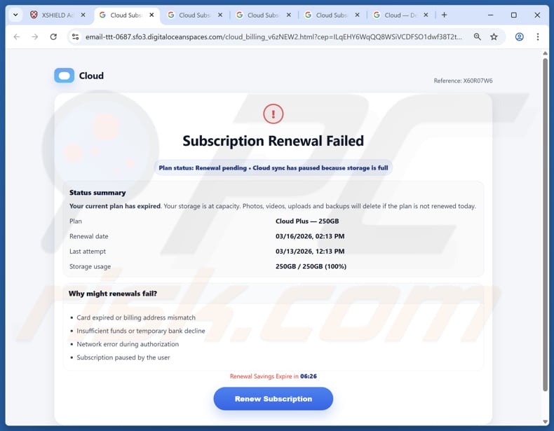 Więcej informacji na temat oszustwa „Cloud Storage Renewal Failed”