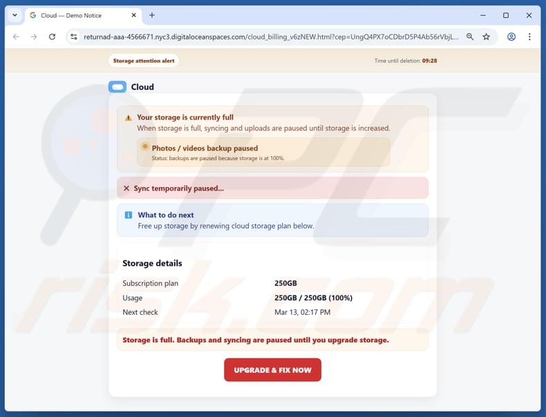 Witryny te stosują taktyki podobne do tych wykorzystywanych w promocyjnych wiadomościach e-mail. Przedstawiają one rzekomy problem z kontem pamięci masowej i nakłaniają do podjęcia natychmiastowych działań, aby uniknąć negatywnych konsekwencji. Twierdzą, że miejsce na dysku jest zapełnione, subskrypcja wygasła lub próba dokonania płatności nie powiodła się.